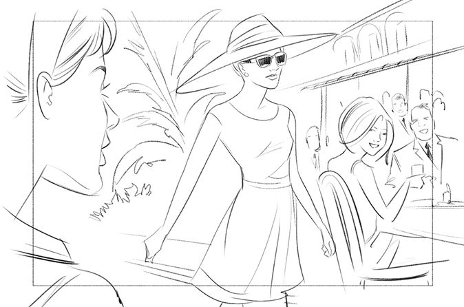 A storyboard artist’s drawings can convey the story and define how the shots will work together in the commercial.